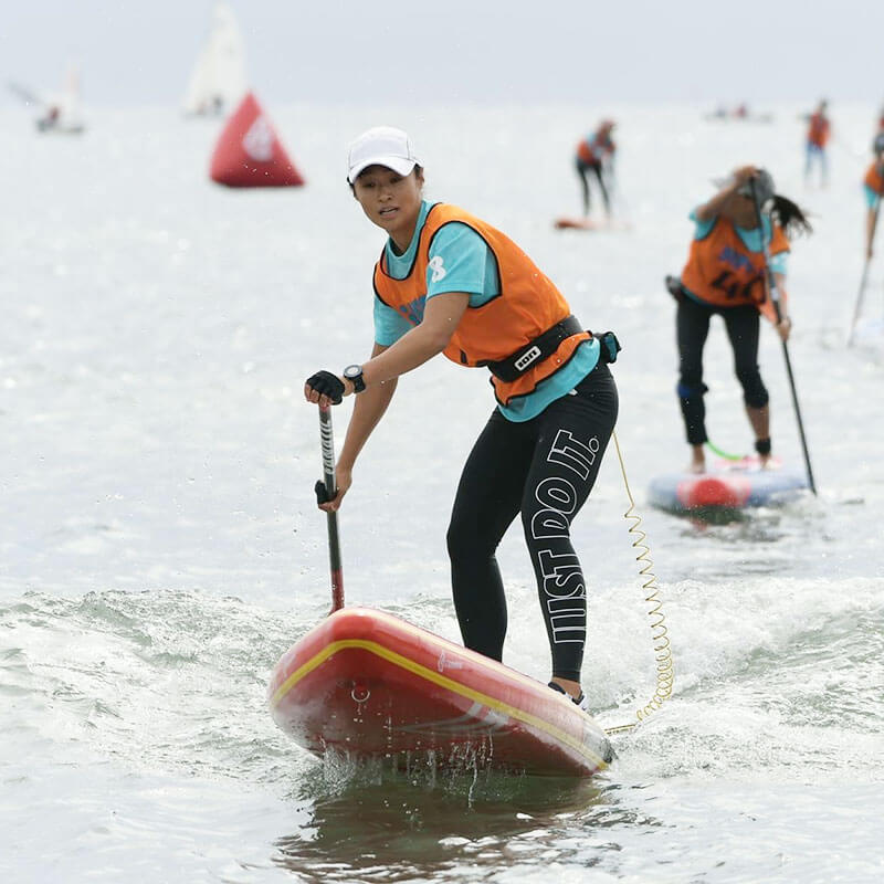 SUPインストラクターは2~3年続けましたが、天気に左右されるのでメインの仕事にするのは難しいと判断しました。そして何より私自身が選手としてSUPレースに出たいという思いが強くなってしまったんです。そこで、今はインストラクターの仕事はキックボクササイズをメインにし、SUPはレースに出場するなど選手としての活動を続けています。